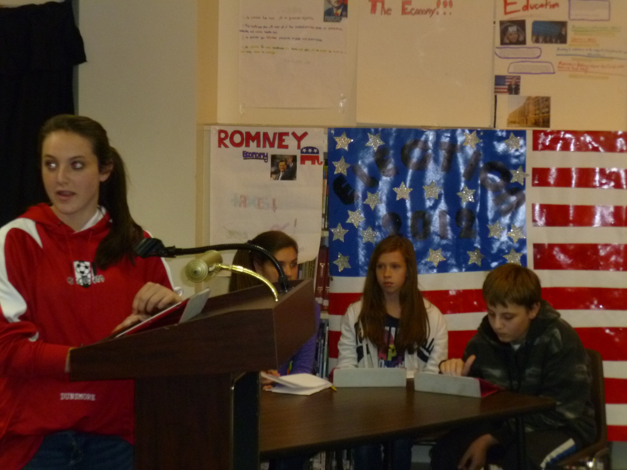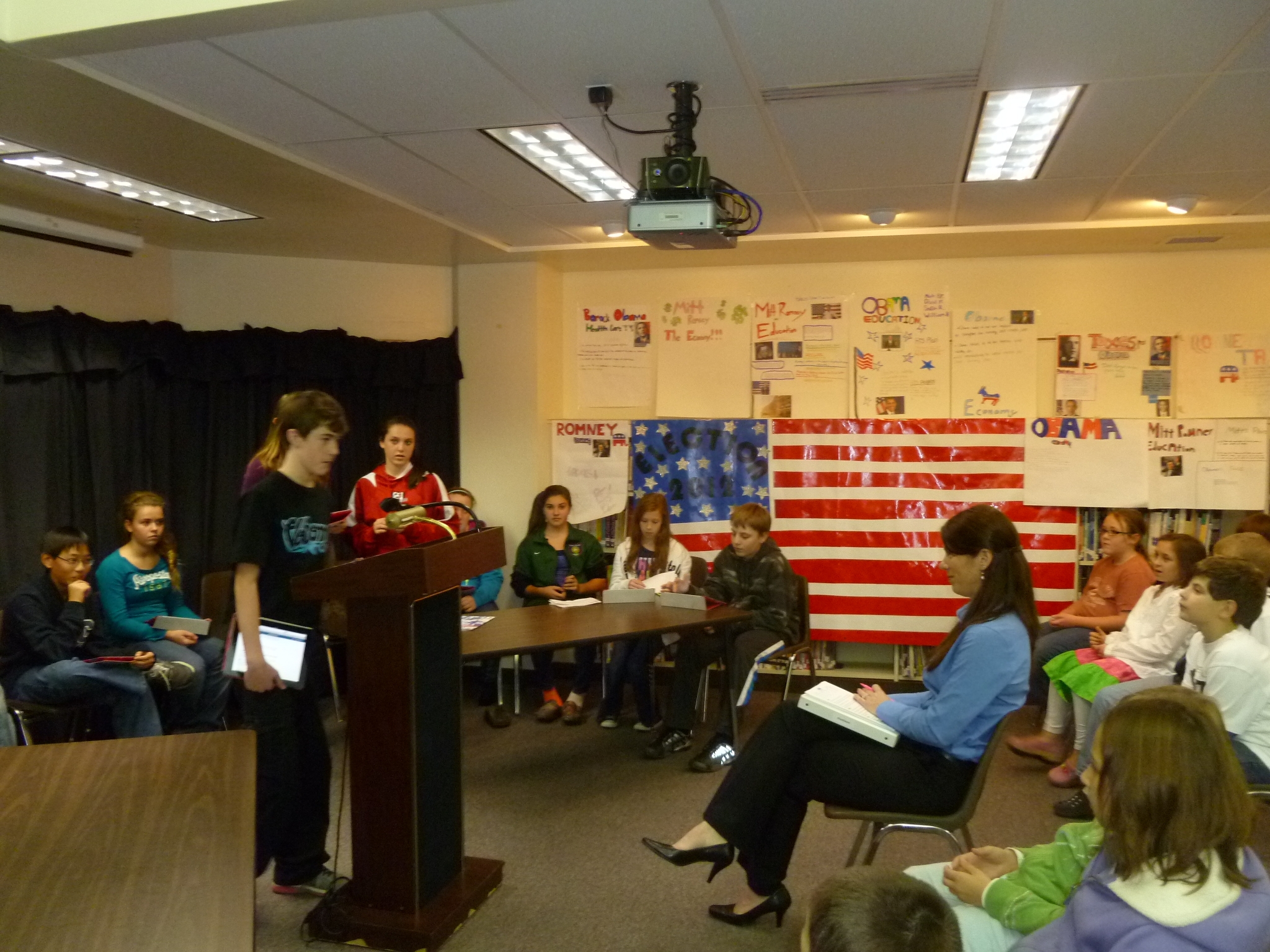 Students had been talking about the election for several weeks and did research on specific topics and the two major candidates. Then each of the four seventh-grade social studies classes held a debate on Thursday, November 1st with Mrs. Knight as moderator.