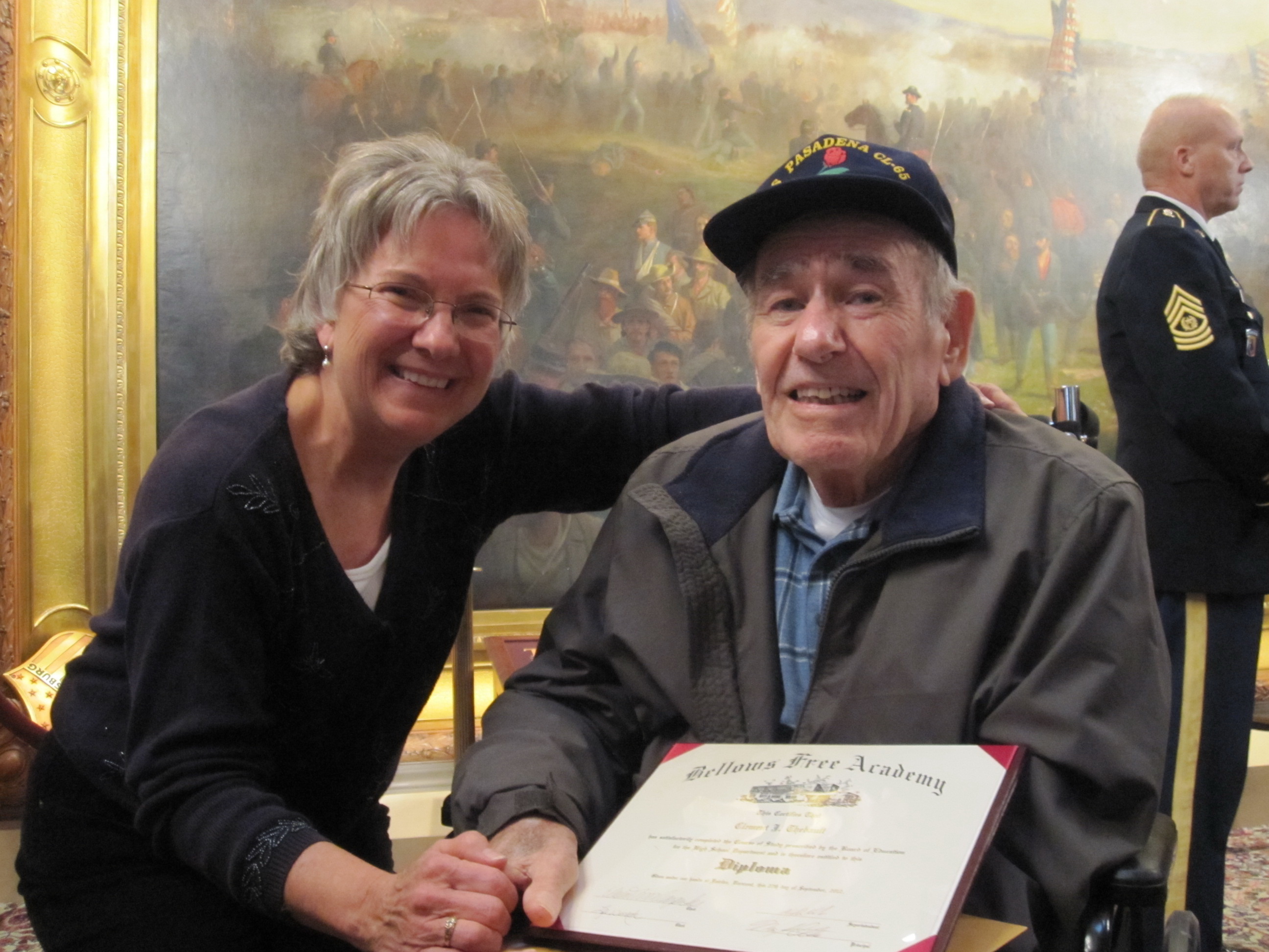 When Clement Thibault left Rumford, Maine to enlist in the Navy in February of 1944, he walked away from his high school education. Now, 68 years later, he has been awarded his high school diploma from Bellows Free Academy in Fairfax through the High School Diplomas for Veterans program.