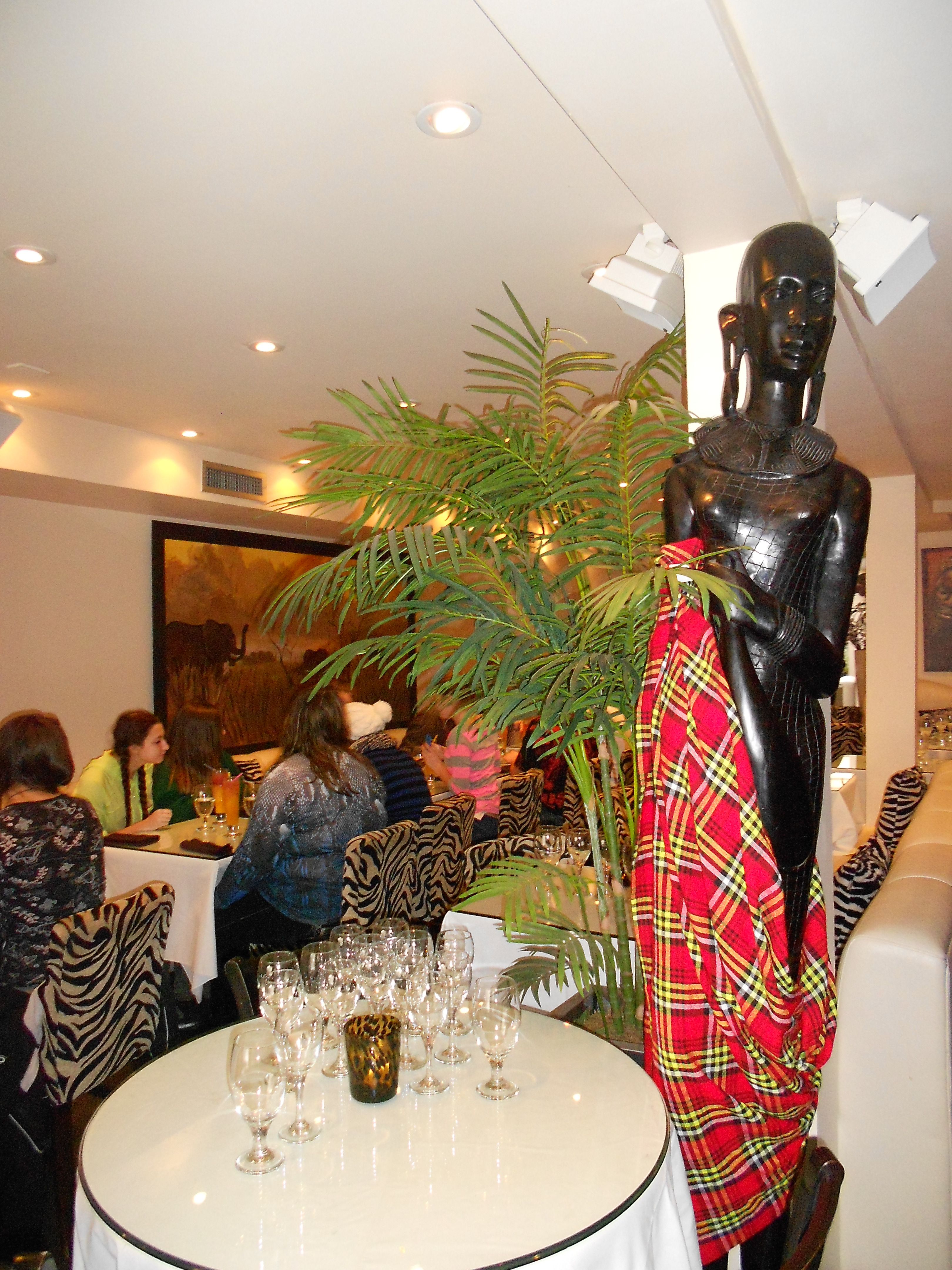 Le Nil Bleu is a beautiful upscale restaurant, decorated in white and zebra patterns with a waterfall, white grand piano, colorful paintings of African animals, and full-size African statues.
