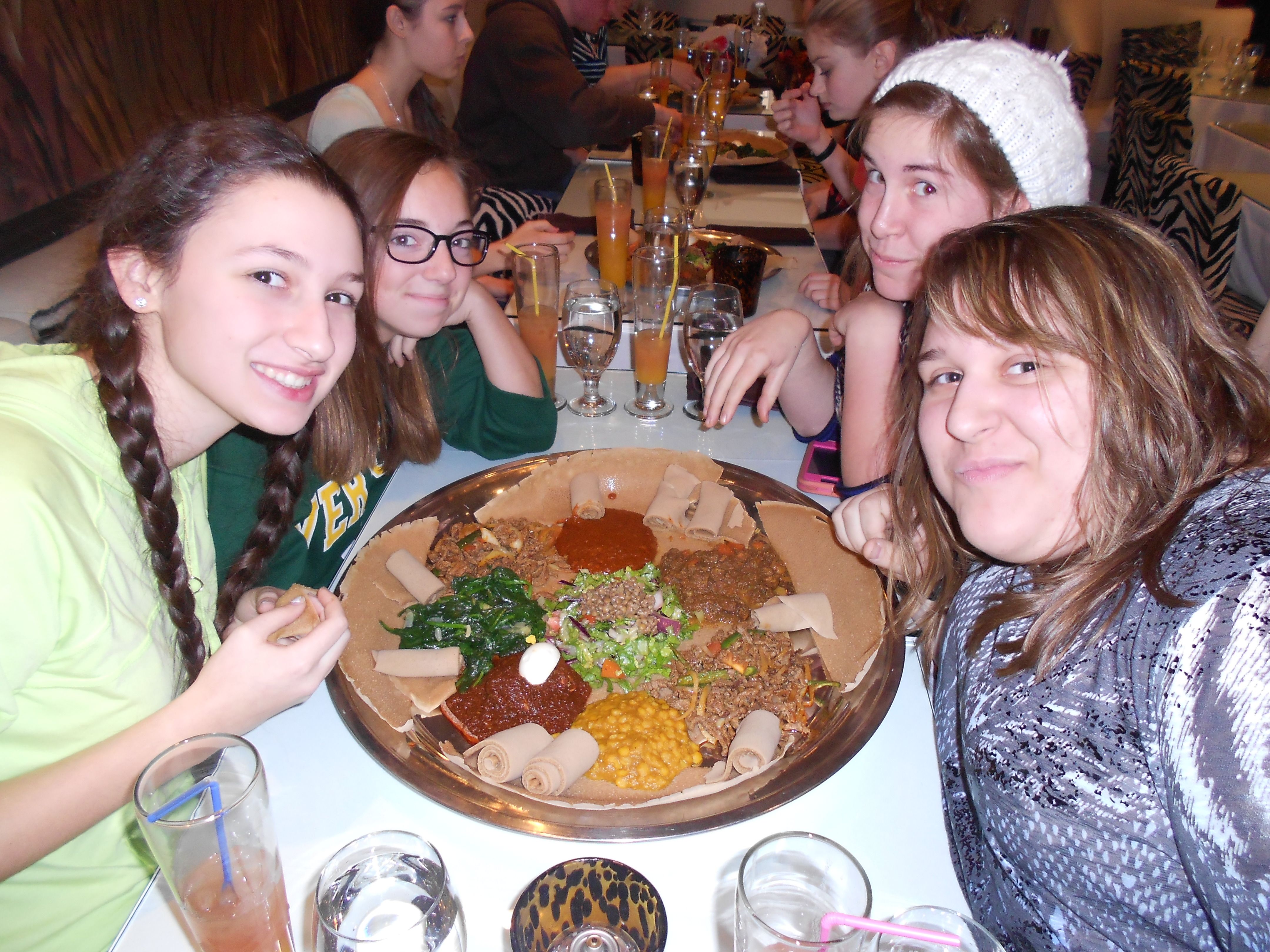The lunch consisted of a wide pancake, served in a large metal dish, topped with flavorful and exotic foods: spinach, lentils,split-peas, lamb, and beef and chicken simmered in colorful and spicy sauces. Lunch was accompanied by a beautiful mango, apple, orange and grenadine juice called Soleil Ethiopien (which means Ethiopian Sun because of the red color of the grenadine descending on the mango juice.)