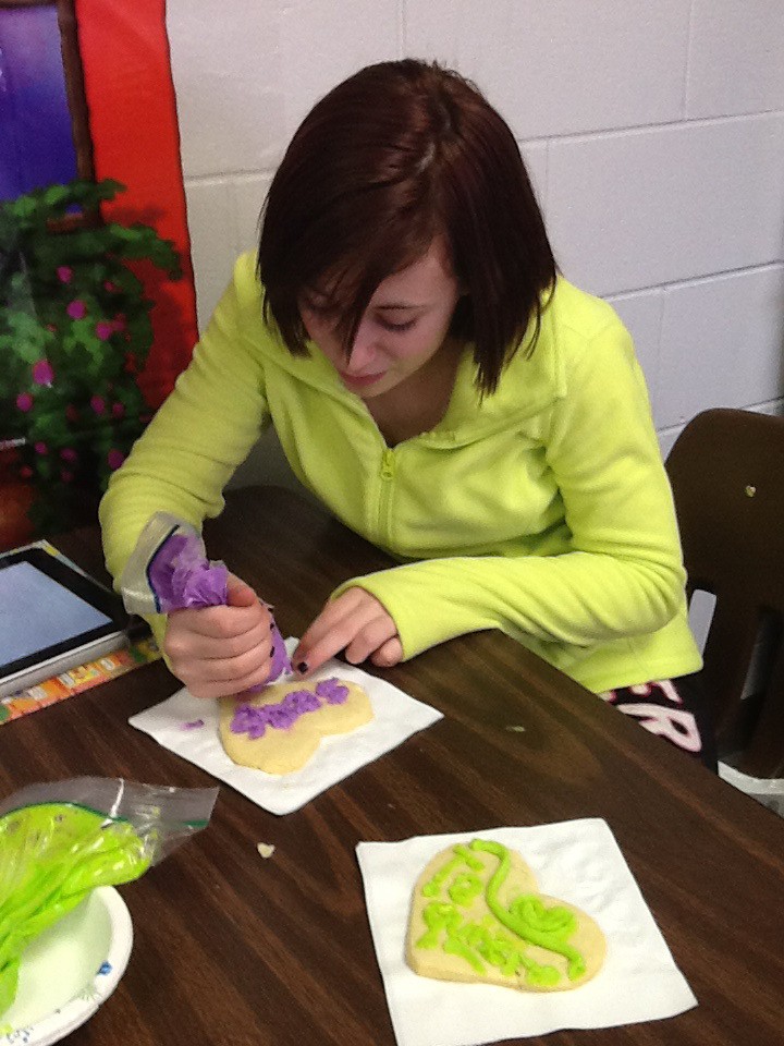 Students celebrated the day in style, practicing the correct pronunciation of Spanish words typically found on conversation heart candy. They then used frosting to decorate a sugar cookie with one of the Spanish phrases.