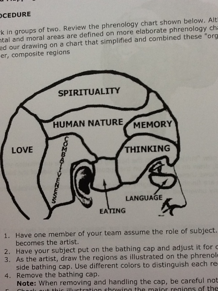 One half of the cap was done as phrenologists believed brains worked in the 1850’s, and the other half was done as scientists understand the brain to work now.