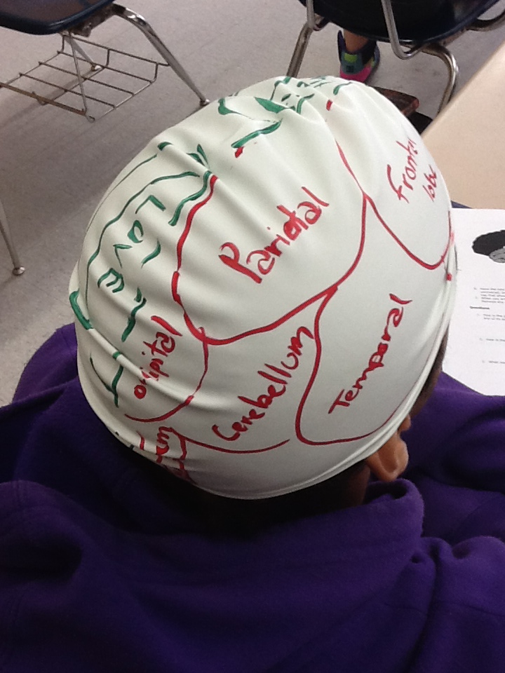 On Monday in class, Mrs. Wills’ students donned swim caps and took turns drawing brains on each other’s heads.