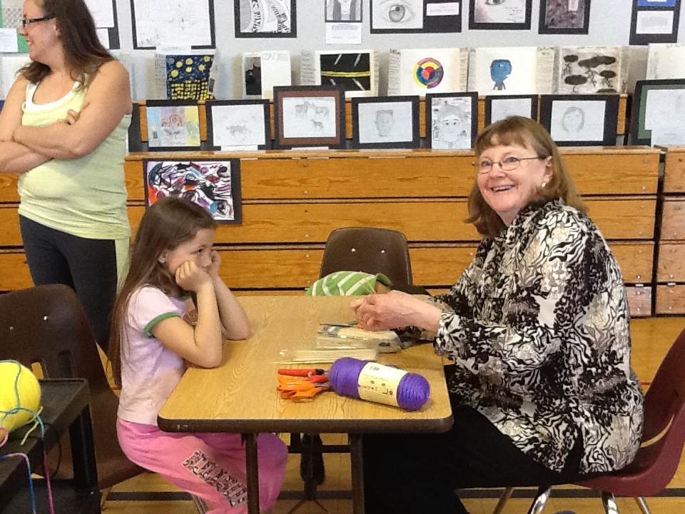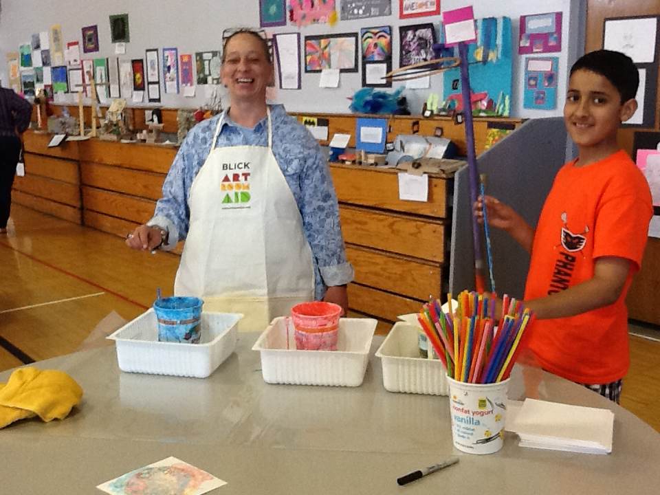 GEMS art teachers Ellen Hsieh and Dorsey Hogg helped children make traditional Mexican Ojo de Dios or Gods Eyes with colorful yarns while working alongside volunteers Jane Longley and Anu Gerg at the bubble painting and bookmaking tables.