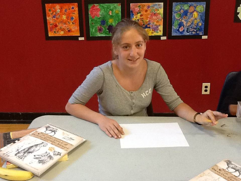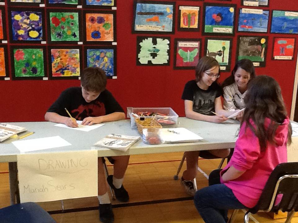 This year the Annual Art Show included a new twist. On-site demonstrations and art activities with local professional and student artists were featured. At the drawing table, student artists Mariah S, Ava W, and Hunter T were working on their own drawings and encouraging others.