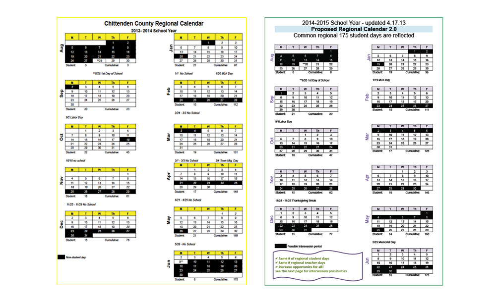 The Champlain Valley Superintendents Association (CVSA) has proposed a change to the calendar currently used by schools in the Champlain Valley. This new model is being considered for the 2014/15 school year, based on the work of VT Superintendents Association (VSA) Educational Quality Framework, which has been endorsed by the VT State Board of Education (VTSBE) and the Vermont Agency of Education (VT-AOE). Under Vermont law, the Superintendents in the Champlain Valley – part of the VT Superintendents Association (VSA) – are responsible for establishing a uniform school calendar for the region (.D, C. S. “CSD Spotlight.” CSD Spotlight. Colchester SD, 23 May 2013. Web. 11 June 2013.)