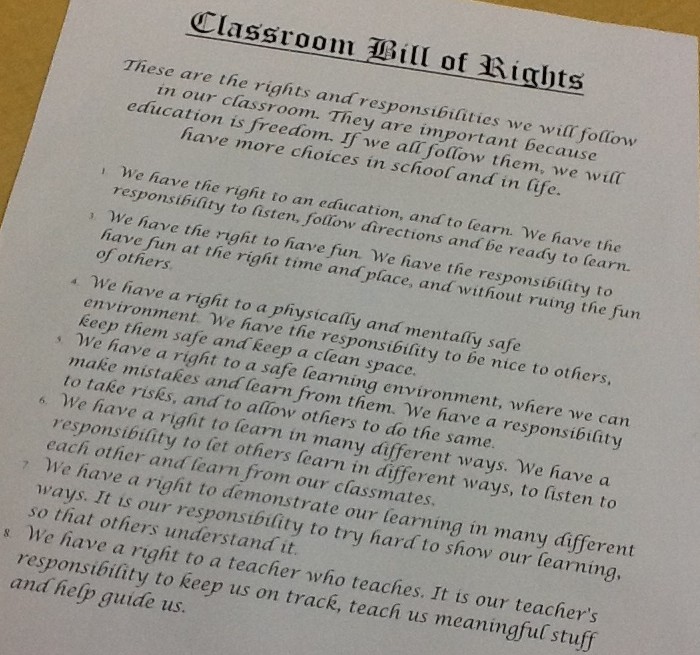After research, a survey, and careful consideration these students drafted their own Bill of Rights. They personalized their rules and responsibilities based on what they thought was important to their own learning. They committed their ideas to paper in the form of a Bill of Rights.