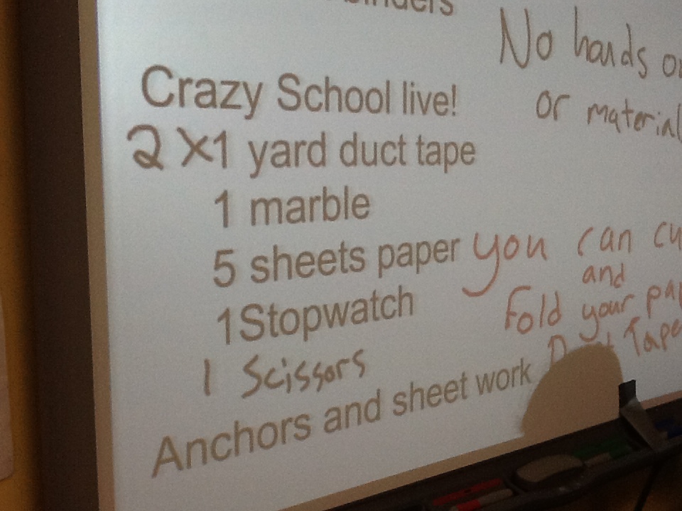The students were provided with paper, scissors, and tape. They were also provided with a stopwatch to determine the length of time it took for the marble to reach the cup. But most importantly, they were not given instructions. Solving the problem through trial and error was an essential part of the challenge.