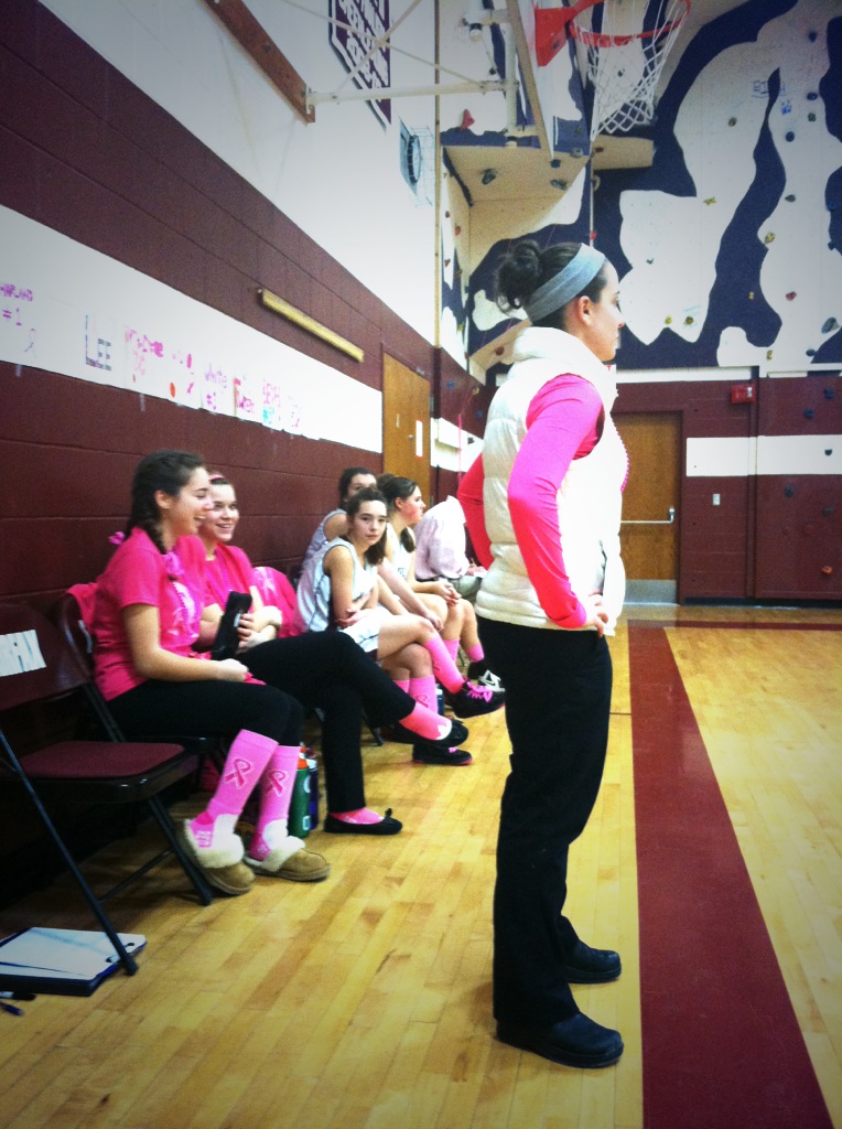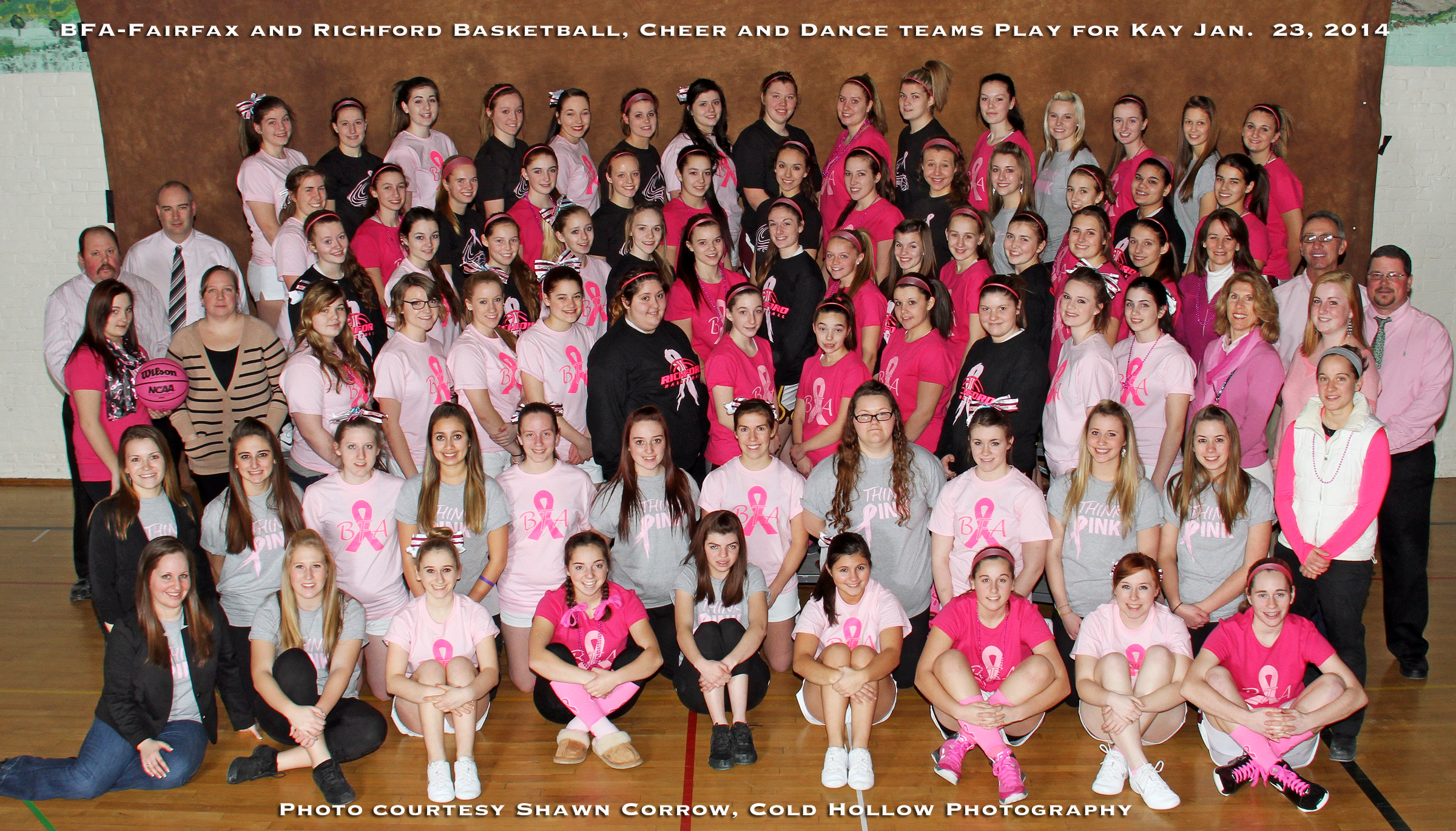 Last night, BFA Fairfax and Richford High School girls’ basketball, BFA Cheerleading, and Richford Dance teams continued its tradition and joined the nationwide effort to raise funds and awareness for breast cancer research. The teams went pink for the 2nd annual WBCA Play 4Kay games (formerly Pink Zone Games). BFA-Fairfax hosted both JV and Varsity girls’ games. All athletic teams and their fans showed strong support by wearing an assortment of special pink attire – shirts, shoelaces, warm-ups, socks, etc. Pink bead necklaces and ribbons were also sold before and at this exciting event between two Franklin County teams who play competitively in the Mountain League.