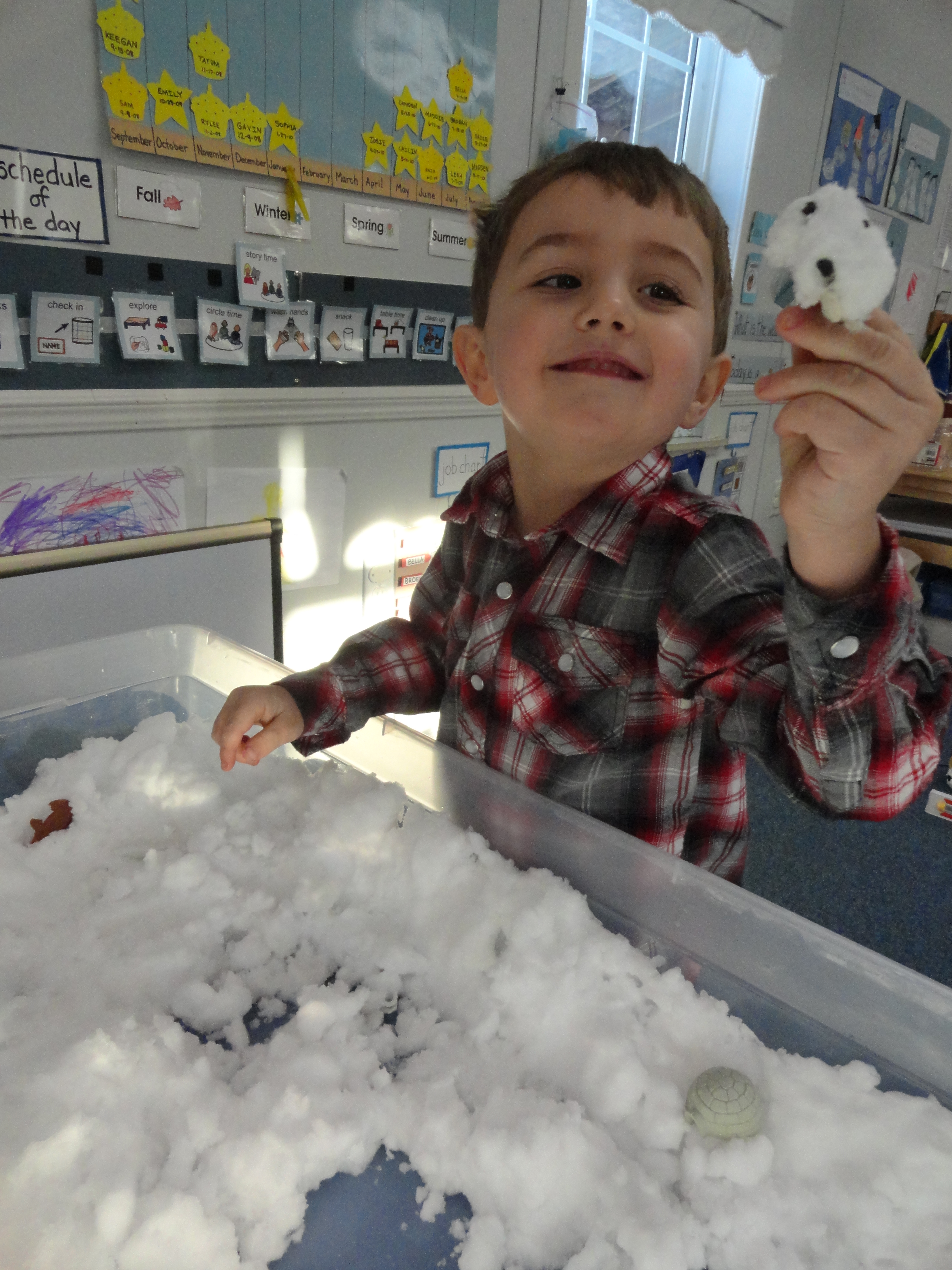 “Due to our cold temperatures, we brought the snow inside to encourage exploration and conversation about snow and cold places,” said Preschool Teacher Nancy Hurt.