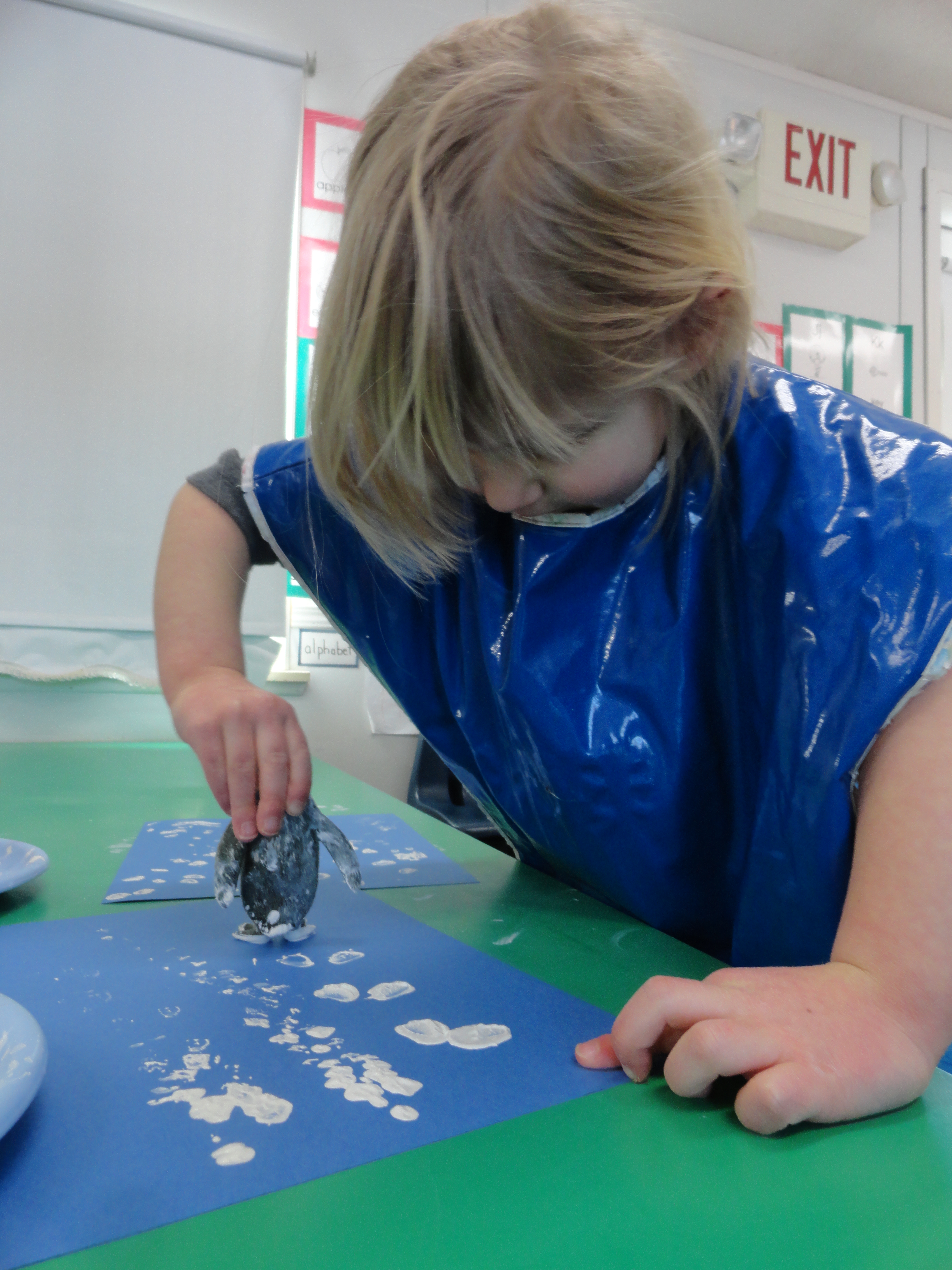 Discussion took off as children made discoveries while comparing different size tracks in the (white paint) “snow” and found the variety of penguins illustrated in non-fictions books and a classroom poster.