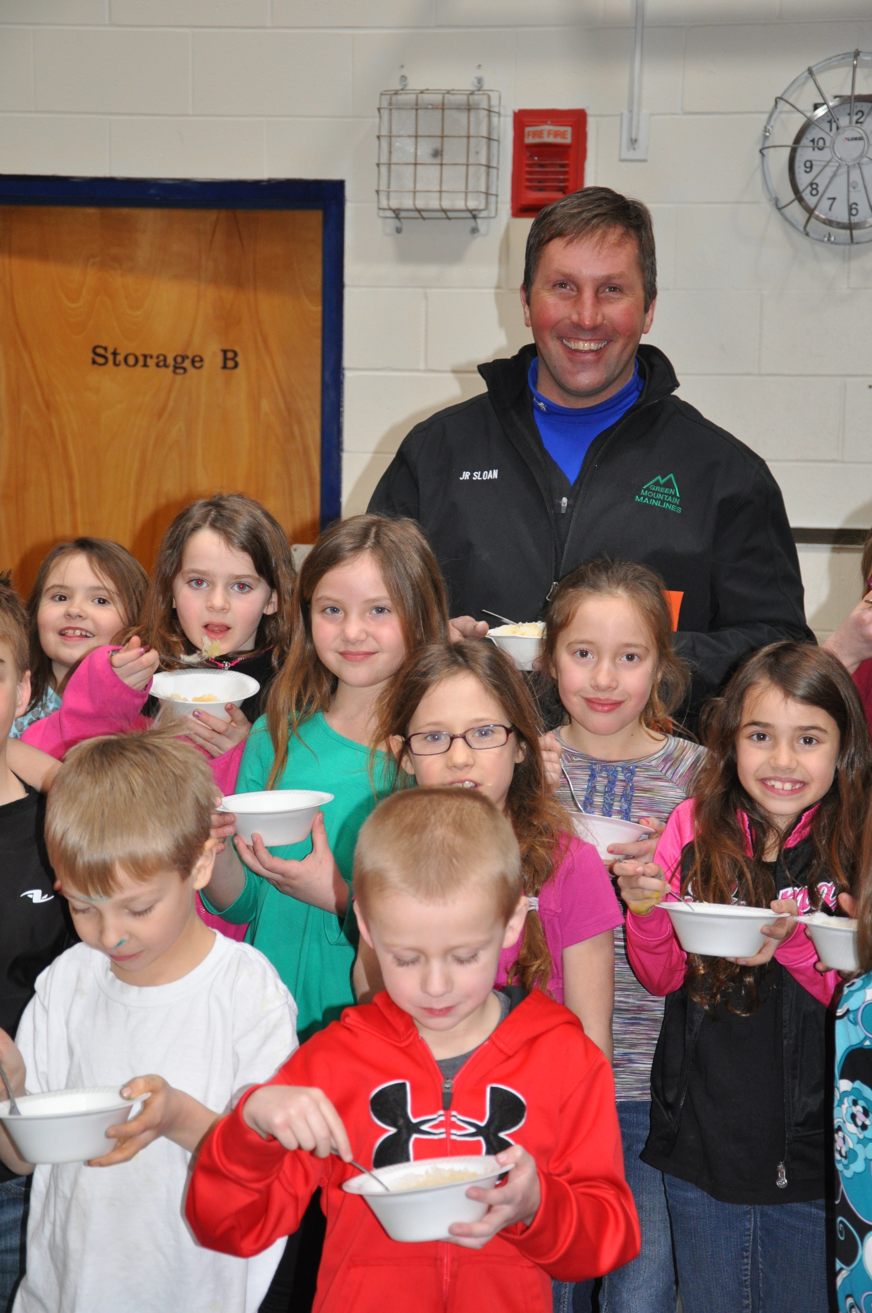 Sloan donated several gallons of maple syrup to F.E.S. for the school-wide sugar-on-snow celebration which followed the presentation, as well as additional syrup to support the school’s breakfast program. Earlier in the day, third and fourth graders worked to harvest the snow for the school-wide sweet treat.