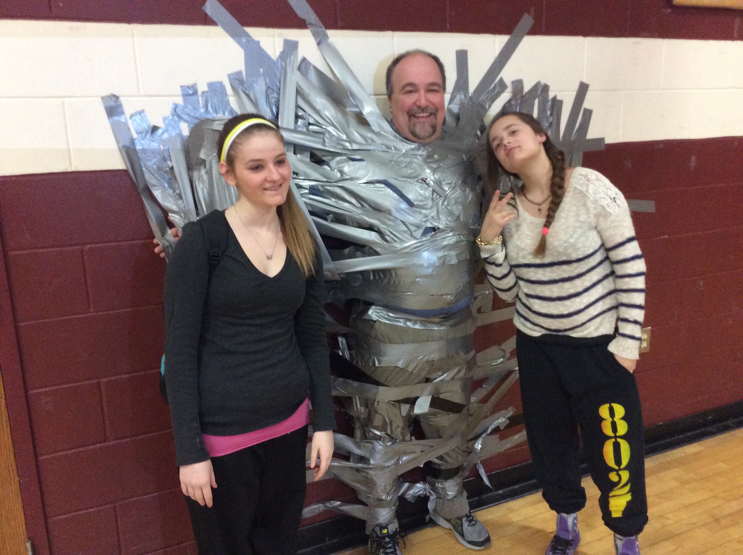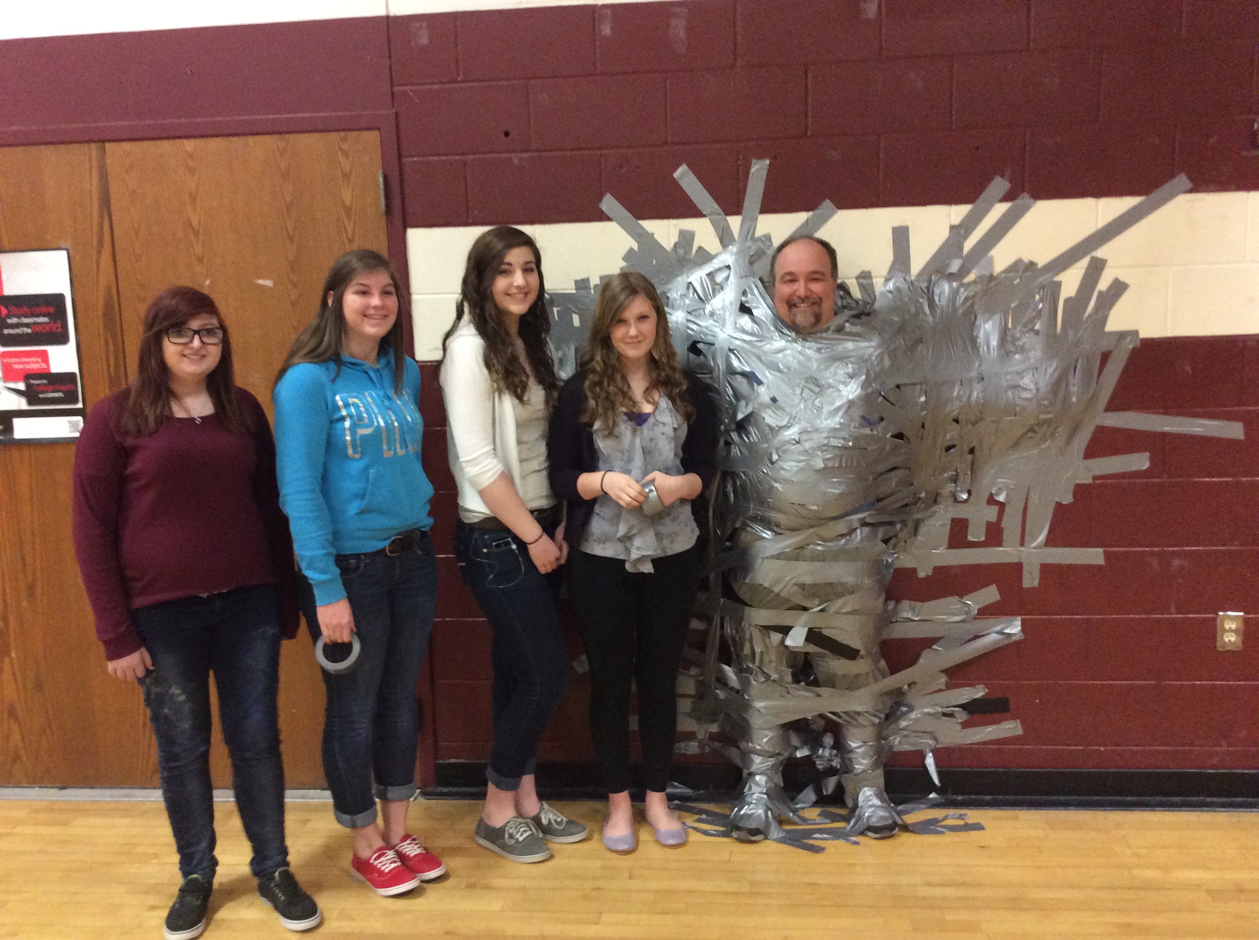 BFA Juniors Madison Irish, Loren Bourne, Morgan McNall, and Meadow Linderman camp up with the idea to raise money for this great charity by duct taping their principal to the wall. This fundraiser was part of the students National Honor Society service project.