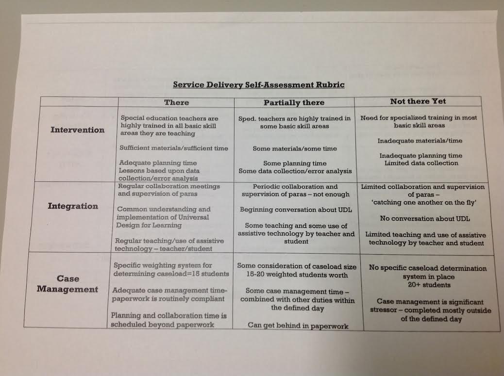 On April 30, 2015 FWSU Special Educator’s participated in a second mini-workshop focusing on “Systems of Support for All Learners.” The teachers were given a Service Delivery Self-Assessment Rubric which focused on: