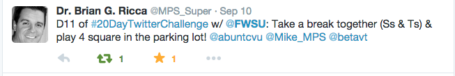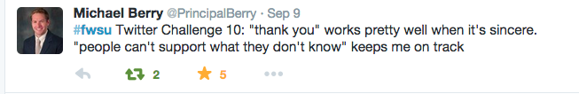 Learning in today’s world should be more about joy, more about sharing of learning, and more about helping each other design learning experiences for our students that will make them highly successful. That is what we strive for everyday in FWSU. But how could we bring our learning, sharing and designing to a new level of collaboration? A level that was inconceivable before technology allowed us to expand our thinking? How could we connect educators with each other? It is with this in mind that we a started the school year with an inaugural #FWSU 20 Day Twitter Challenge.