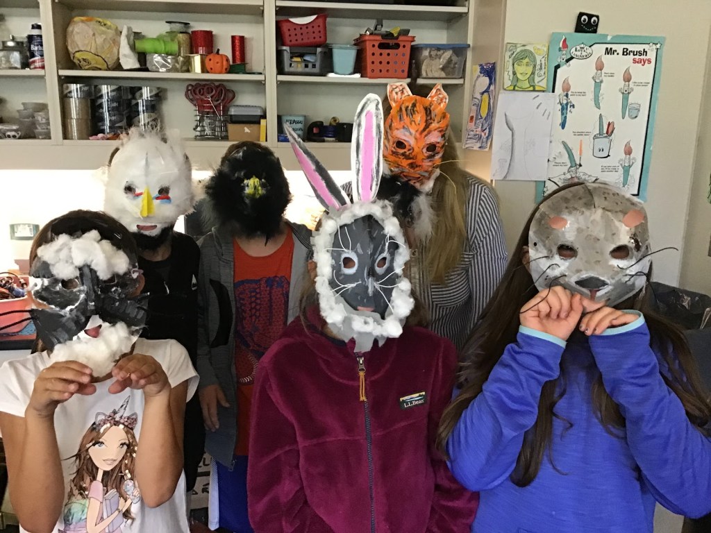 Mrs Knapp’s language arts class was the first group to participate. Fourth grade students explored how animals can have symbolic meaning. Students learned about the symbolism of the tiger in the book The Tiger Rising, then chose an animal to represent or protect themselves. Students researched Native American symbolic meaning of animals, using iPads for image searches. With choice of a variety of art supplies, students demonstrated their creativity through creation of animal masks. They decided what the most important features of their animals were, then came up with ways to use the materials to sculpt, paint and add texture. Finally, they reflected in an artist statement.