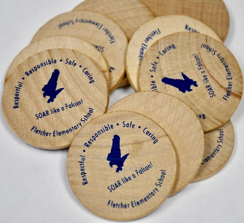 Students are intermittently recognized when they meet school-wide expectations. The recognition comes in the form of small wooden “falcon” tokens, representing the school mascot. Tokens accumulated in classrooms and other locations around the school result in class and school-wide celebrations.