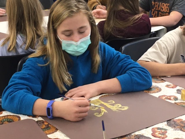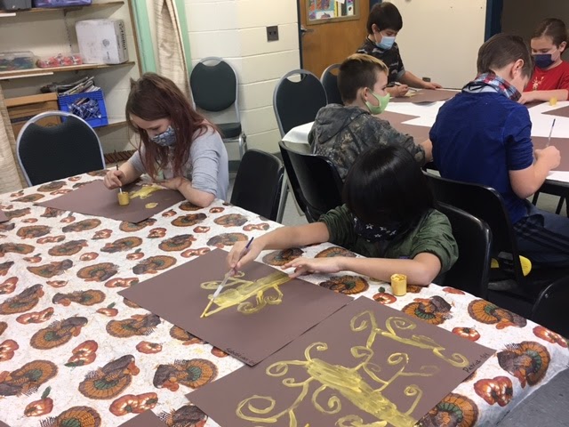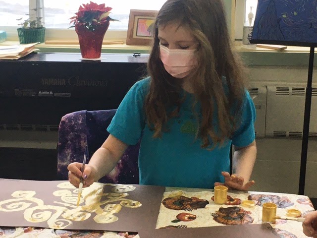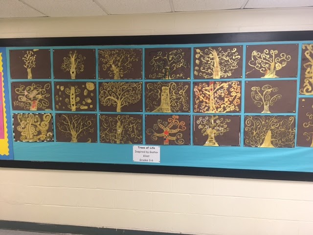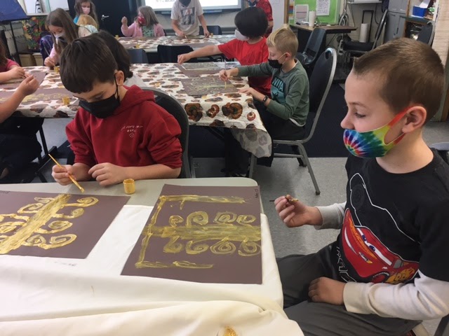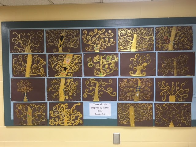 All artists in grades 3-6 created gorgeous “trees of life” inspired by the artist Gustav Klimt. Each artist was provided with gold paint to create their tree. They also practiced and then added meaningful symbols to their work when the paint was dry.