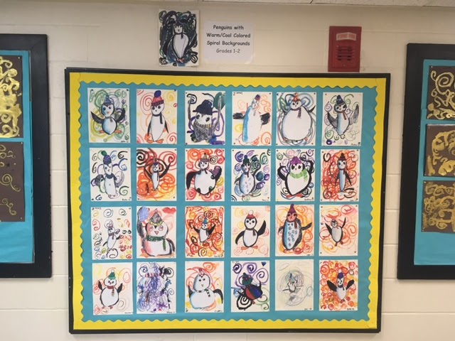 Artists in grades K-2 have been learning about color. Here students painted spirals in either warm or cool colors. They then completed a guided drawing. Kindergarten students drew a polar bear. Students in 1st and 2nd grade drew a penguin.