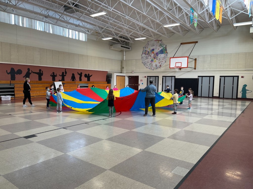 As students spread out across the gym they danced, jumped, and began to raise their heart beats. Then a few laps around the gym and they were “officially” ready to start the activity for the day. Drum roll….. The parachute! Which I fondly remember from my PE experience.