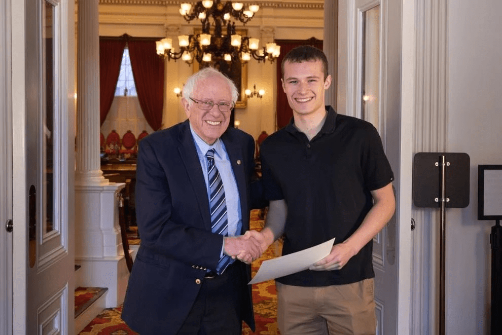 Global Citizenship Teacher Joe Emery: “It was very exciting seeing Sam, Alaina, and Jacob participate in the roundtable with Senator Sanders and other Vermont students. They more than held their own sharing their views and addressing questions from Senator Sanders, especially when he was playing the devil’s advocate. A common element in their essays was a deeply personal connection. It came through in their writing and their discussion with Senator Sanders and the other finalists. I encourage Sam, Alaina, and Jacob to continue to engage with our political process. Who knows, one day they could be in the position of Sanders! They would have my vote…”